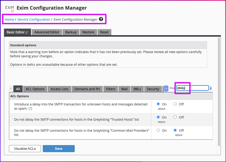 Your server is fine. The settings are nonsense. MX Toolbox is being blocked by a security feature in WHM Exim and therefor spits out the wrong information. The workaround is to allow the MX Toolbox server to query your WHM server without delay by adding to Greylisting. Whitelist these IP addresses by “Trusted Hosts” one entry per line: