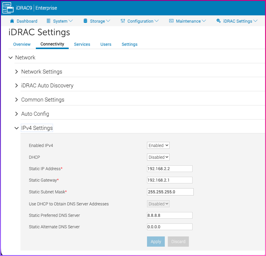 iDRAC Settings (far right) -> Connectivity tab -> Network -> IPv4 Settings